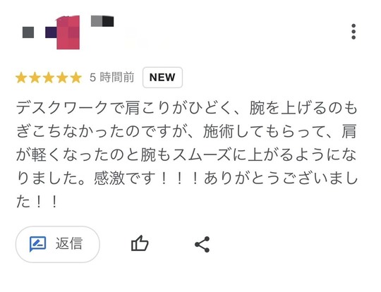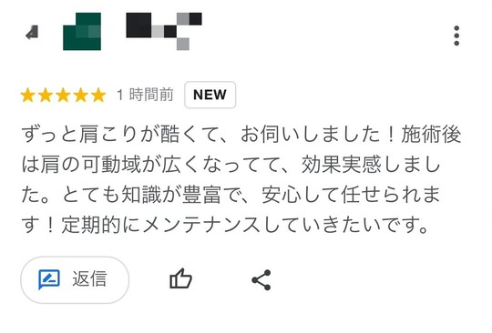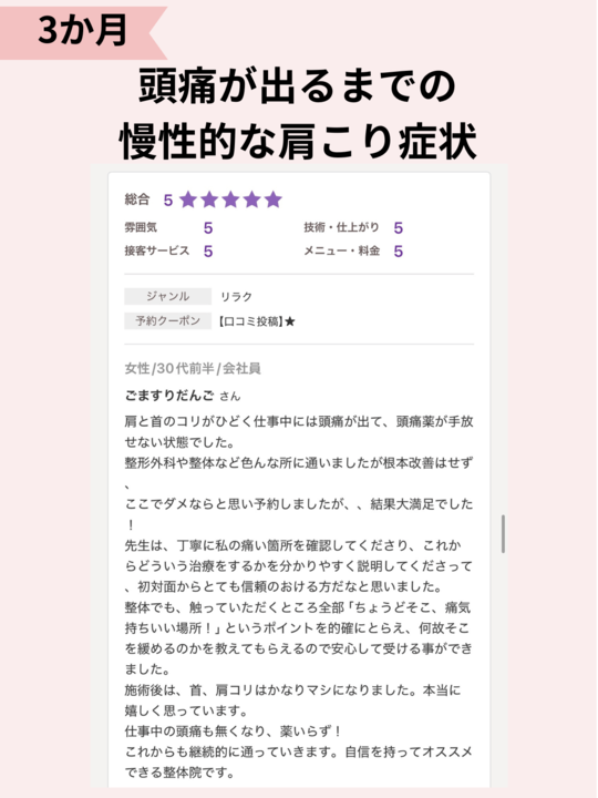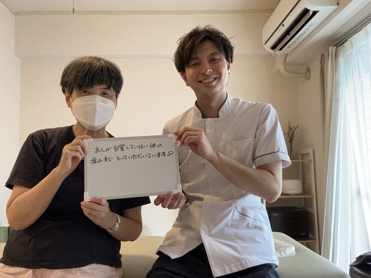 紹介してもらい、診て頂くと筋肉の硬さだけでなく、今の状態がどうなっているのかもしっかり教えてくれるので、原因も理解できて肩こりも楽になってとても嬉しいです。