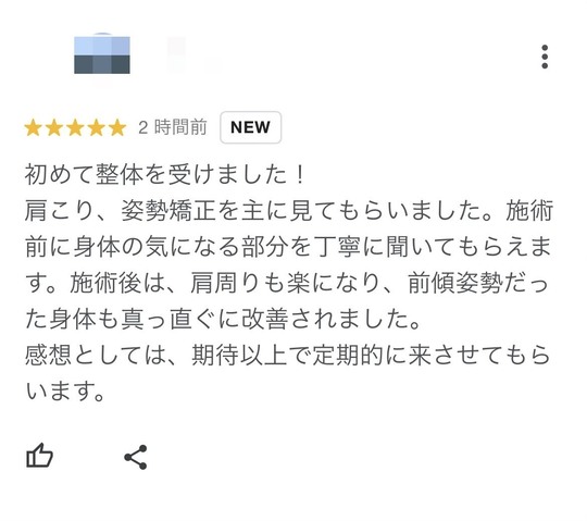 普段から座り作業が多く、悪い姿勢で上のモニターを見ながら作業をすることあり首や肩こりが辛くてこのままにしておくと将来が不安。手などに痺れがおきてきたりしたら嫌だなと思いMIRAIE整体院に来ました。自分で猫背で背中が丸く肩が前に入るような感覚はありました。施術後は普通に座っていても背筋が伸びるような感じで、座って上を向いても首のしんどさがありませんでした。筋肉の硬さだけでなく、日常生活の背景などを理解していただきながら