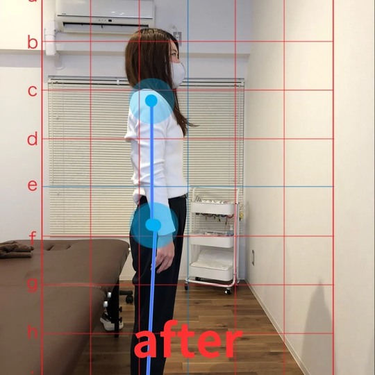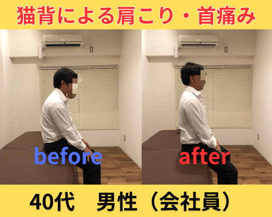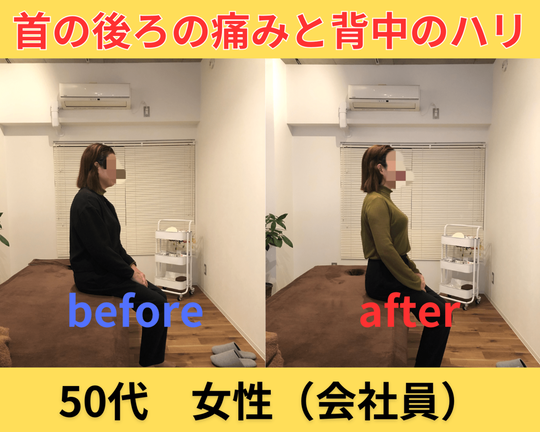 慢性的な肩こり・首の痛みで自分ではどうにもできない。肩を回したりするけどまたしんどくなることの繰り返しでした。最初に写真を撮られた時は自分の姿勢の悪さ唖然としてより身体を治さないとという気持ちが高くなりました。施術が終わって座った瞬間に姿勢が良くなった実感があり肩回りが軽い!楽!の感覚がありました。とても感動しました。今後はしっかりメンテナンスをしていく事重要ですね。