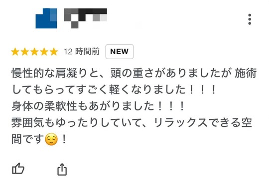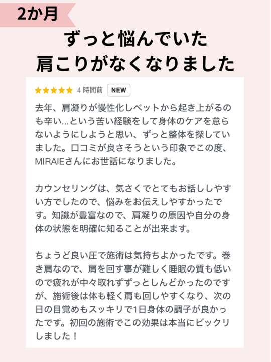 今後も体の困りごとはMIRAIEさんにお願いしようと思います。