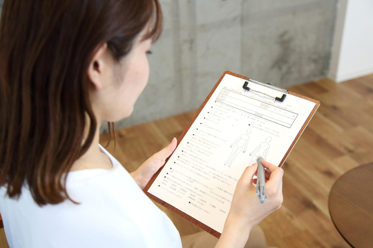 初めての方には、問診表のご記入をお願いします。お身体を改善するために、お症状やお悩みなどについてのご記入をお願いいたします。